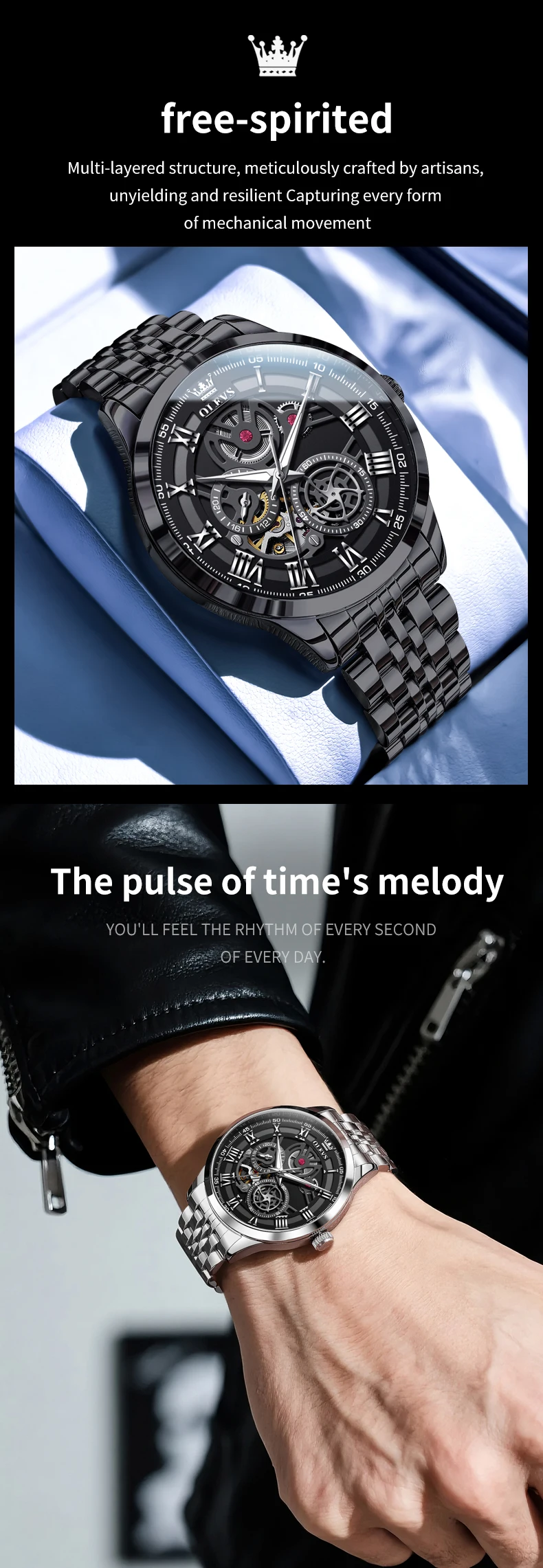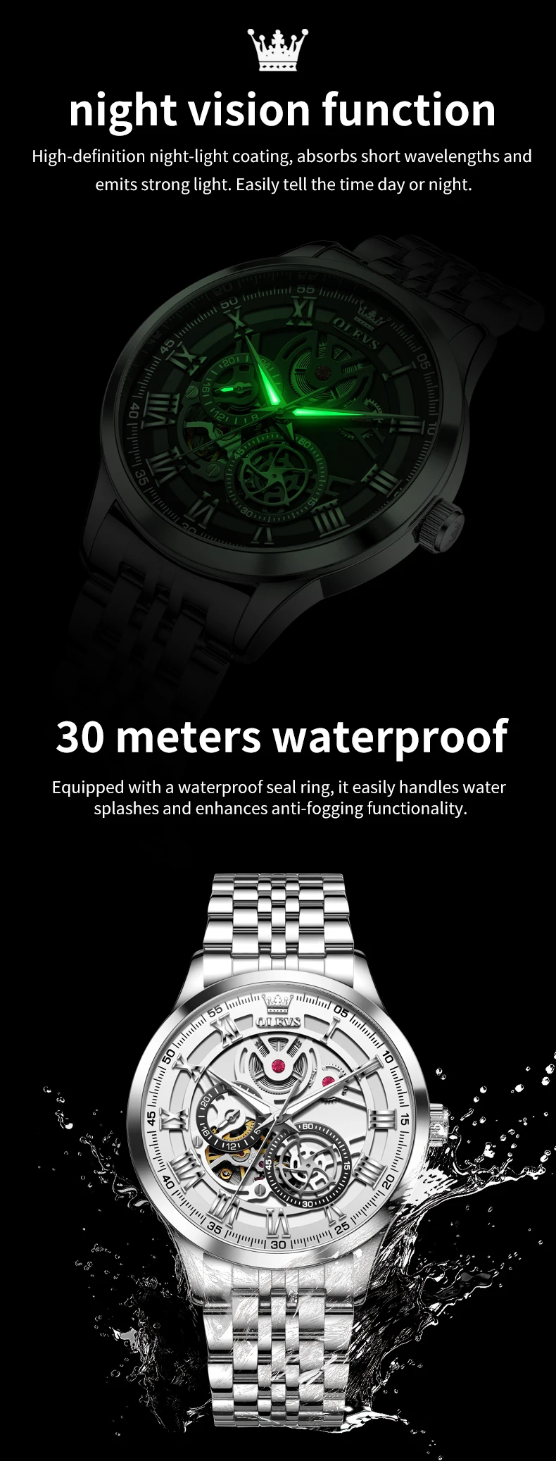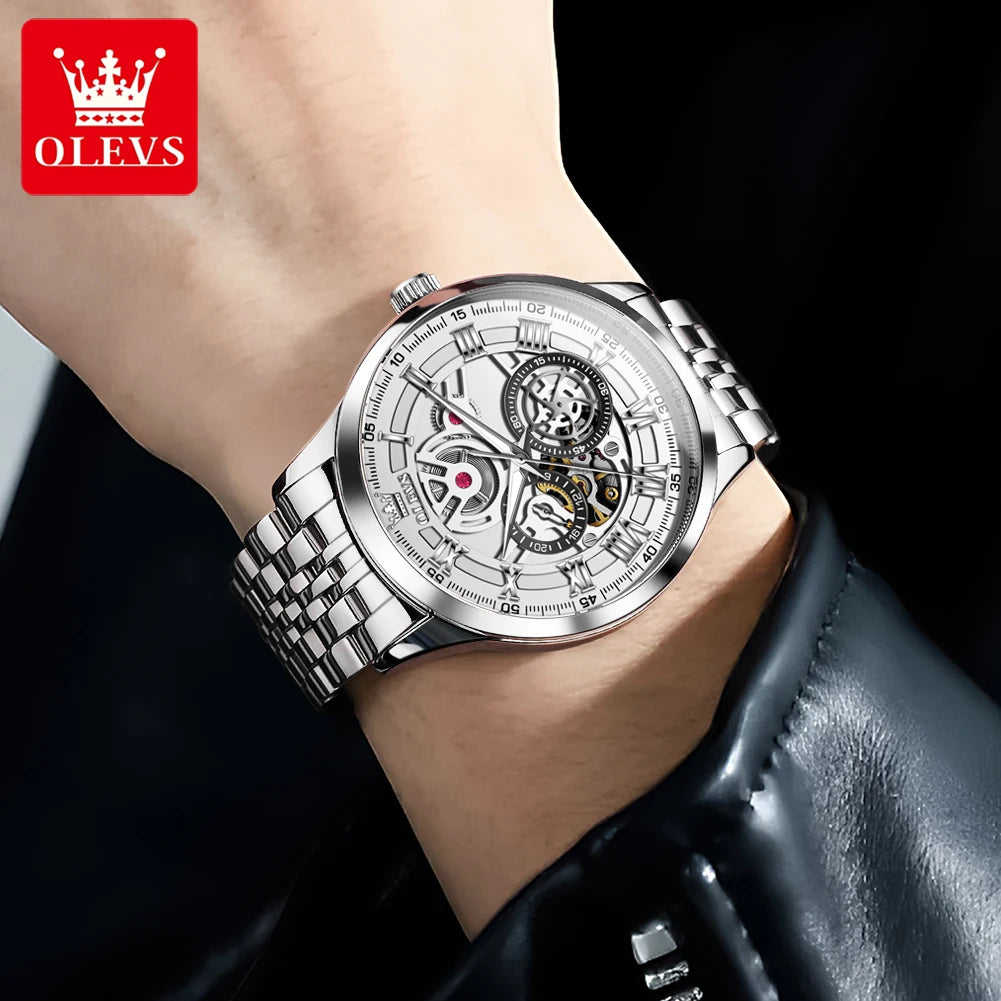 OLEVS 7076 Mechanical Watch for Men Waterproof Skeleton Chronograph Sports Fashion Wristwatch Man Hand Clock