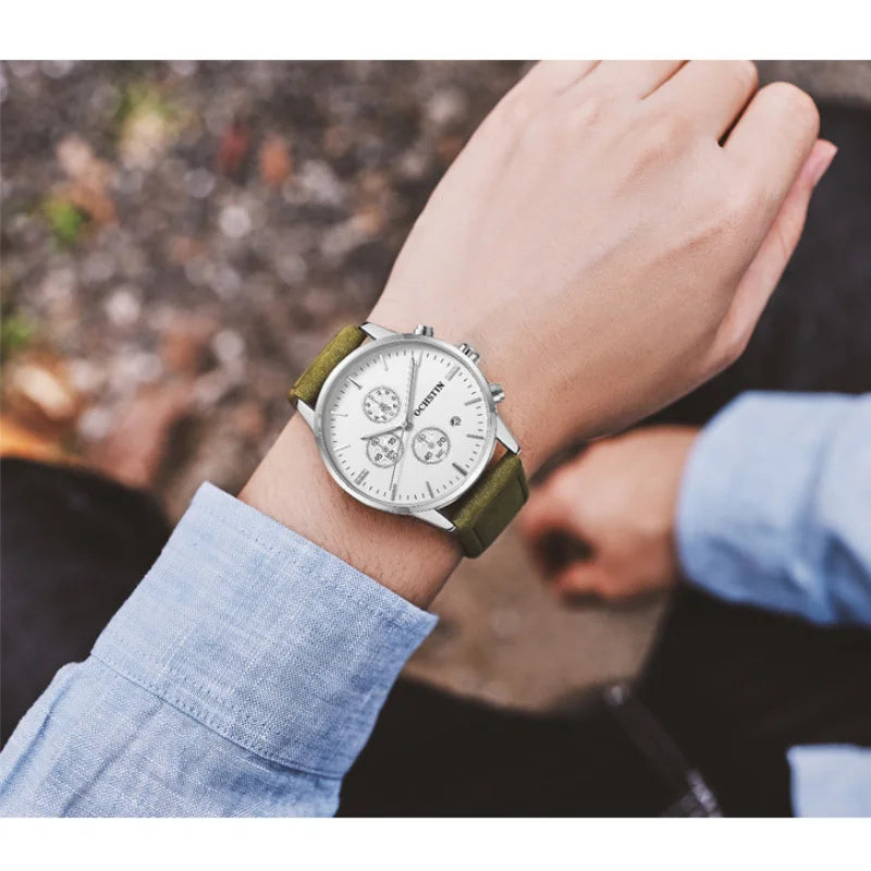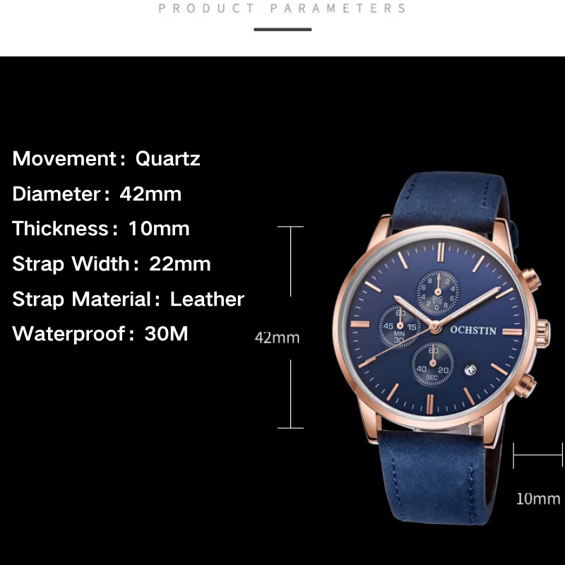 Quartz Watch for Man Multifunctional Chronography Series with 42mm Dial and 10mm Thickness Leather Strap Waterproof 3ATM