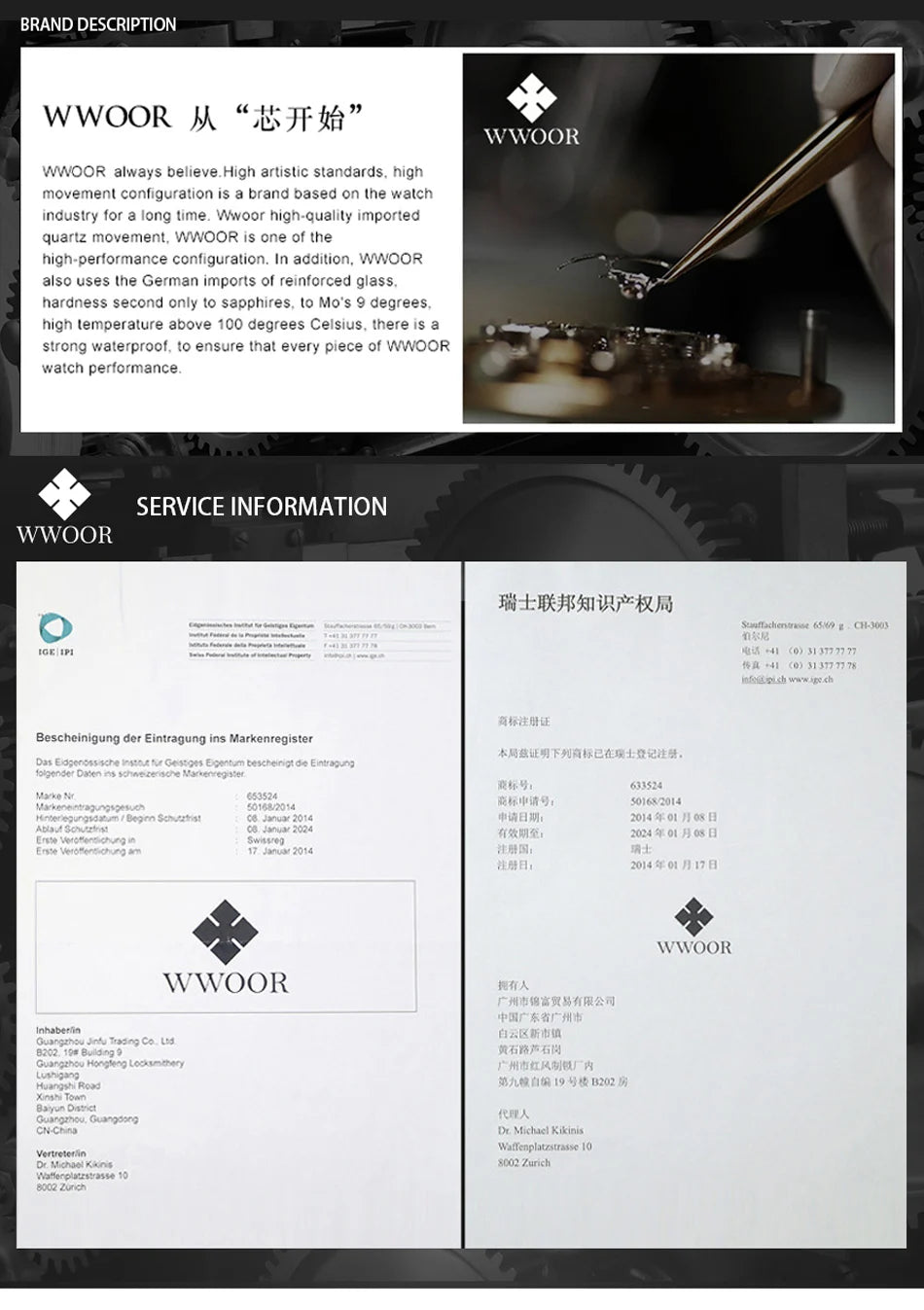 PRODUCT PROPERTY:✨ 1: If you are looking for our product, the brand of wwoor is your good choice.The movement of our product is quartz.The clasp type of our product is bracelet clasp.The case material of our product is alloy.You can also find plenty of styles of our product, such as fashion & casual.The type of our product is quartz wristwatches.The feature is water resistant.The certification of our product is ce.Product original from cn(origin).