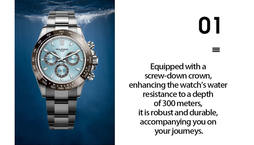 With a 300-meter water resistance rating, it's the ideal companion for water sports and adventures. Whether swimming in the pool or enjoying a thrilling ride in the rain, it handles it with confidence. The screw-down crown acts as a loyal guardian, completely isolating water when tightened, providing comprehensive protection for the delicate movement, allowing you to explore the underwater world without worry.