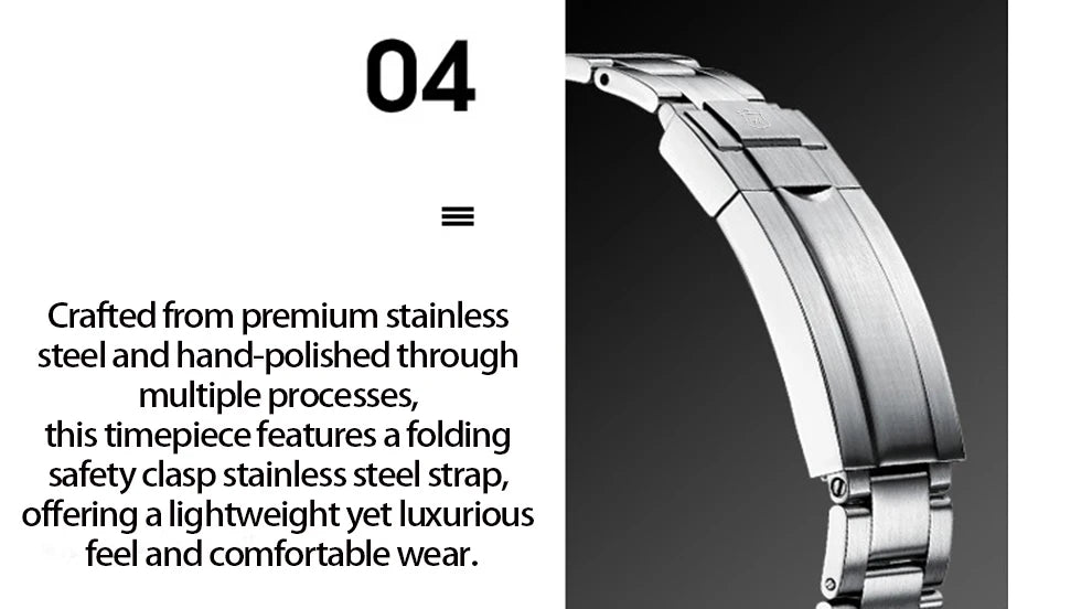 Unique luminescent design: The oversized hour markers and broad-leaf hollowed-out hands are coated with a high-performance luminescent material, emitting a dazzling glow in the dark. Whether on a solo deep-sea dive or a nighttime journey, this light clearly indicates the time like a lighthouse, allowing you to precisely control your pace and remain calm even in the dark.