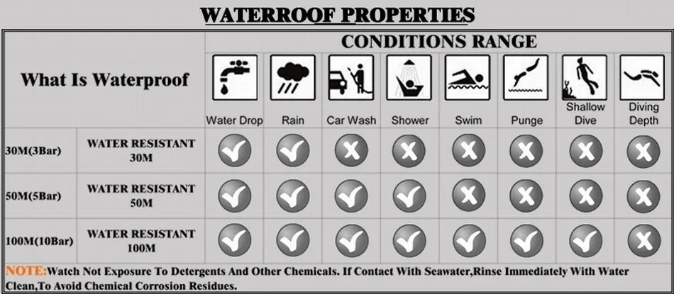 3ATM/30M Water Resistant (Not Support showering, swimming and diving)